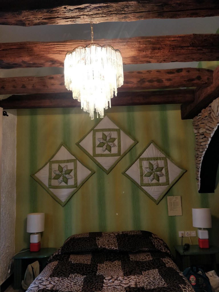 La chambre, dans une ancienne grange refaite entièrement pas le propriétaire, était vraiment charmante. Rustique, et originale aussi : du bois, des poutres apparentes au plafond, une porte en forme de feuille pour la salle de bain et des briques.