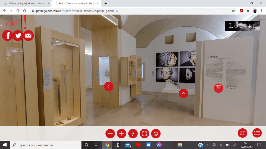 On peut remarquer la présence de – et +, qui nous permettent de regarder de plus près les œuvres. Le ? pour nous aider à utiliser la plateforme, le cadre pour mettre en plein écran, et C des copyrights, le petit plan de l’exposition à droite que nous pouvons consulter et qui nous indique dans quelle salle nous sommes. Et le dernier bouton sert à afficher et masquer cette barre de tâche.