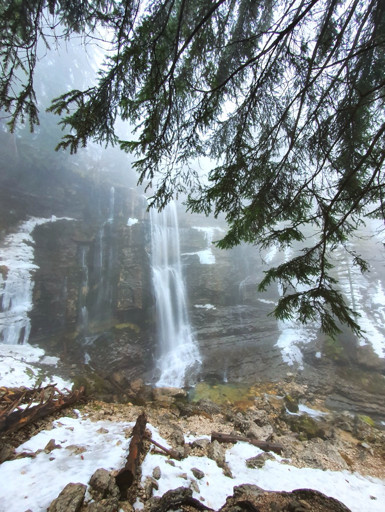 On est descendu presque au pied de la cascade et nous avons traversé un petit pont avant de poursuivre notre chemin dans la neige.