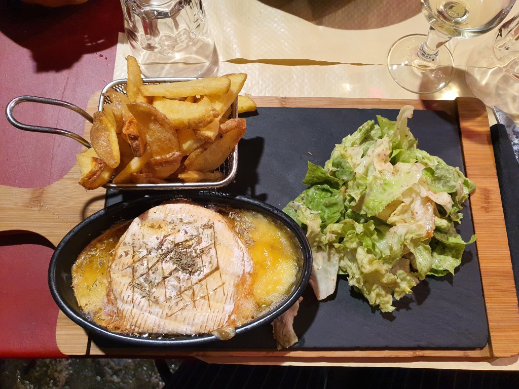 Comme souvent dans les bouchons lyonnais, le choix végé n’est pas très vaste, mais il y a toujours quelque chose de dispo (souvent, ce sont des ravioles de Royan). Ici, un camembert au four.