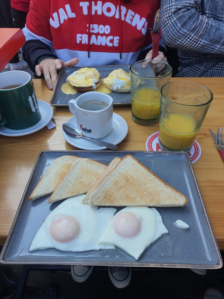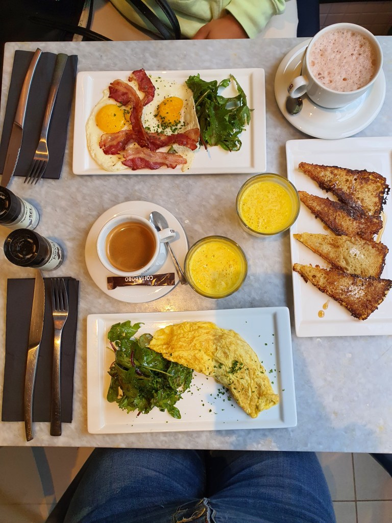 Petit déjeuné entre copines au Bavard : omelette et salade, café, jus d’orange et pain perdu au menu !
