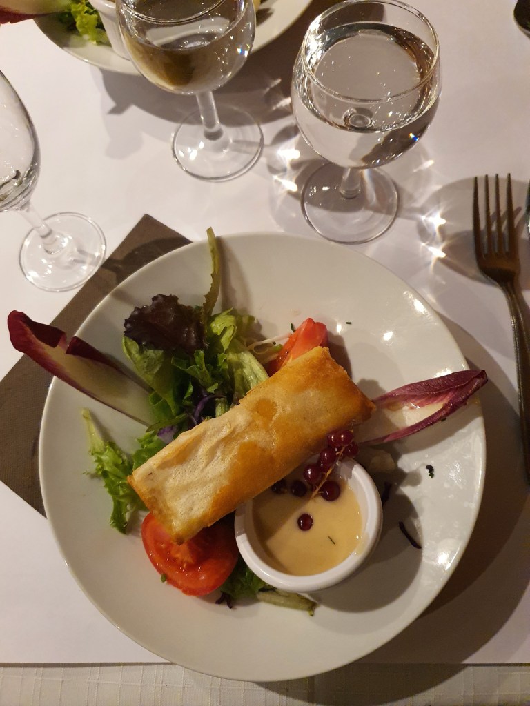Un bouchon lyonnais délicieux, avec un personnel vraiment sympa (ils nous ont ouvert une jolie petite salle, à l’écart, juste pour nous, car ils étaient complets). La photo d’un croustille-chèvre en entrée, avec du vin blanc.
