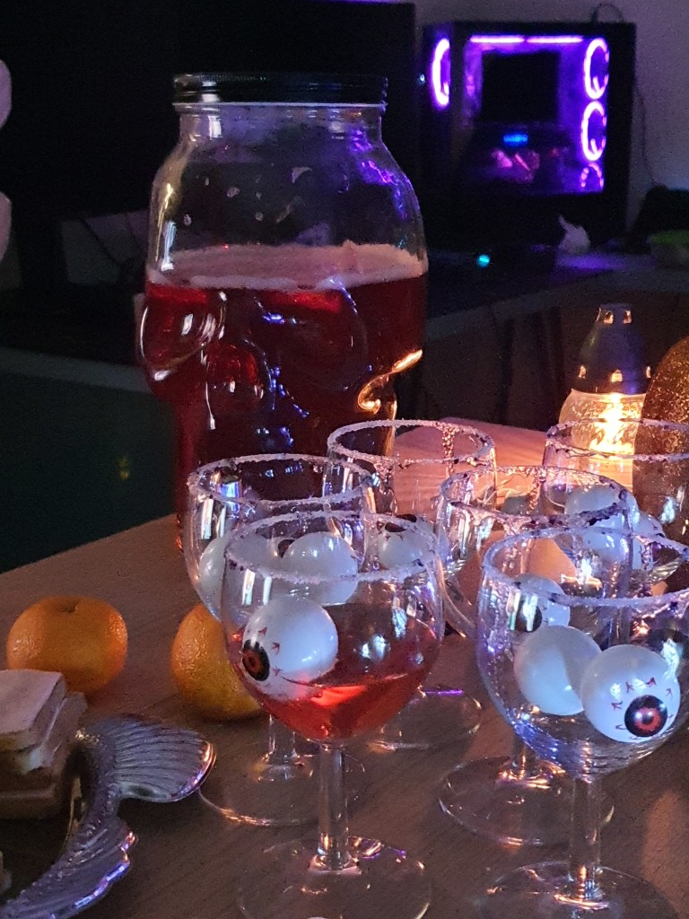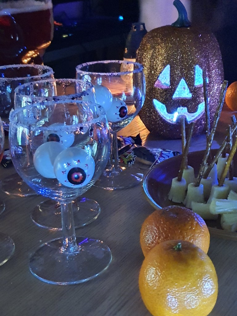 - Les verres avec des yeux : une petite idée de décoration pour servir vos cocktails à vos amis : des yeux en plastique dans le verre, et du sucre (avec du colorant rouge).
