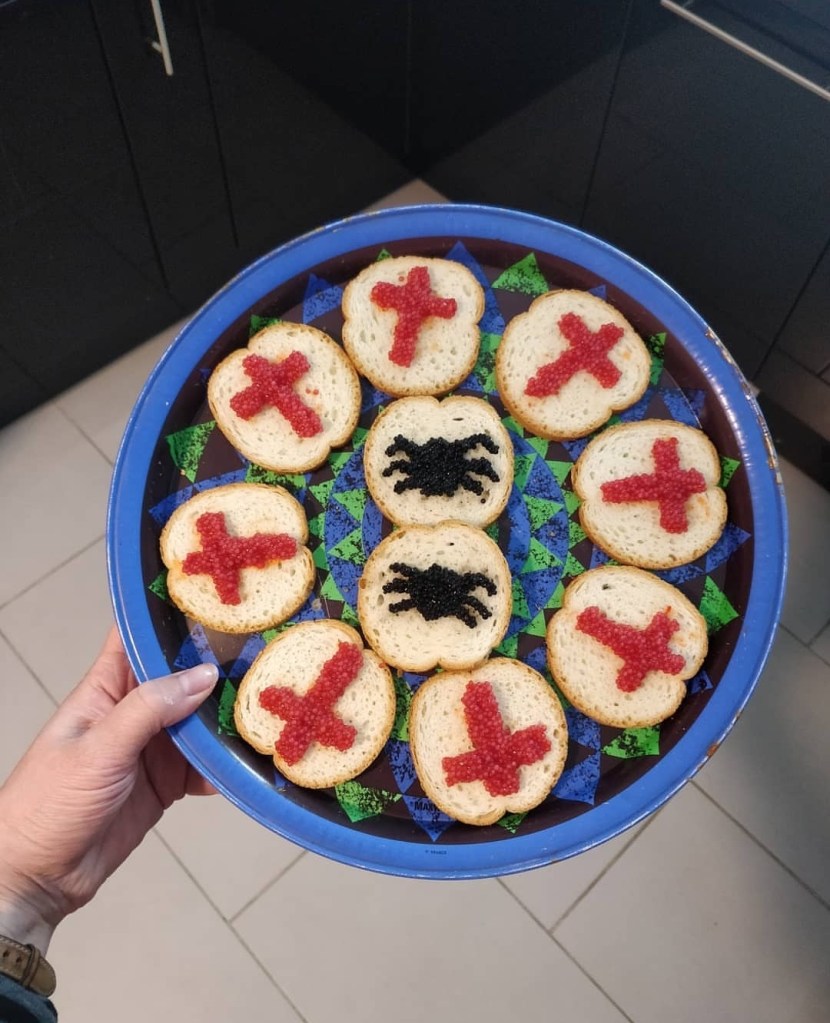 - Les toasts croix et araignées : avec des œufs de Lompe ou n’importe quelle chose que vous voulez tartiner, former des croix et des araignées avec une petite cuillère sur des toasts. Je vous préviens, c’est plutôt long ! Mais le rendu est top