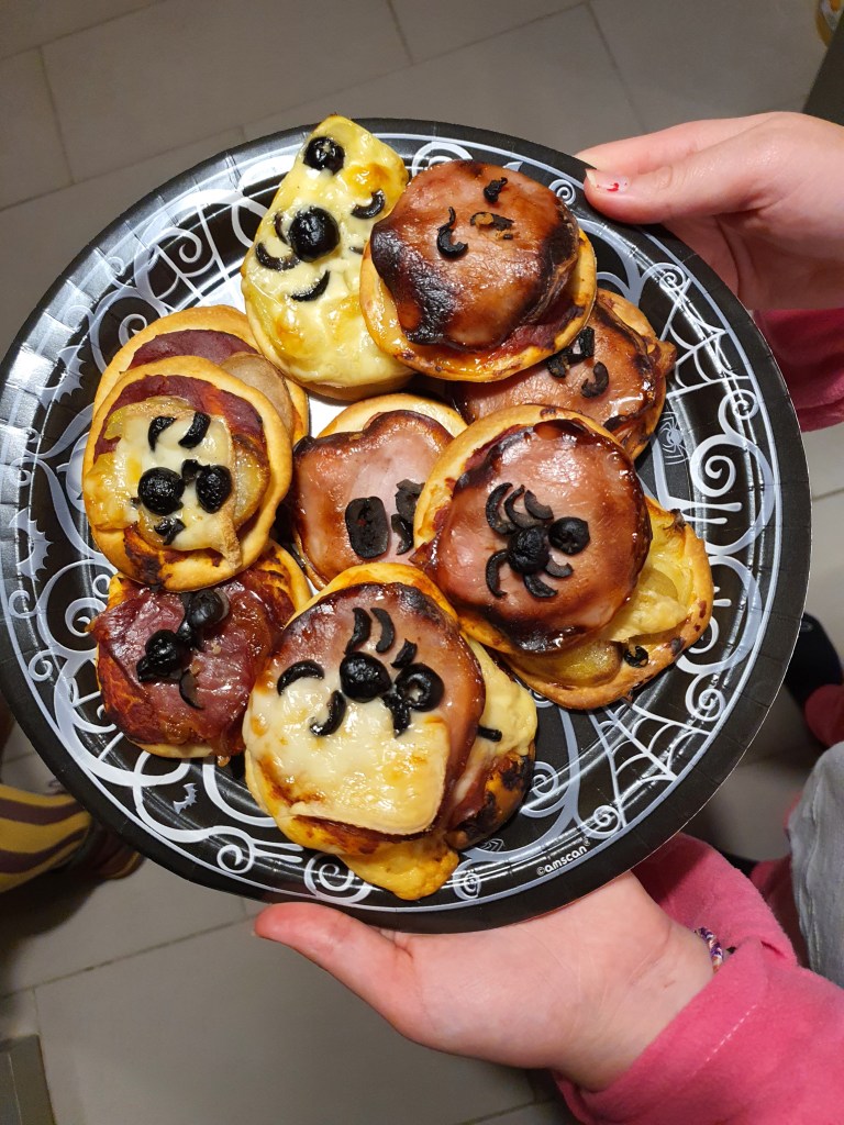 - Les mini-pizzas araignée : avec un verre en guise de pochoir, découpez des petits ronds dans votre pâte à pizza pour faire des mini-pizzas ! Ensuite, il vous suffit de découper les olives de façon à former de petites araignées dessus. Attention : plus il y a de fromage, plus l’araignée va « bouger » avec la cuisson, essayer de les former sur quelque chose qui ne fond pas à la cuisson.