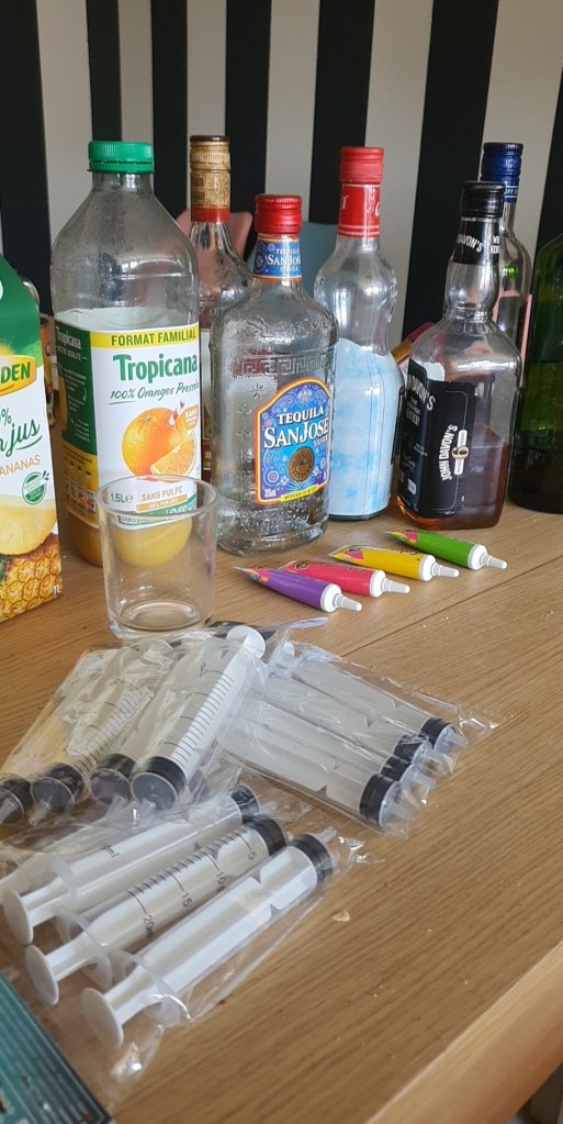 - Les seringues surprises : j’adore les seringues surprises ! Il vous suffit juste de différents alcools et différents jus de fruits, et de plusieurs colorants alimentaires. Vous l’aurez compris, vous créez des cocktails pour les seringues et, grâce au colorant, pas moyen de savoir de quel cocktail il s’agit avant de le boire !