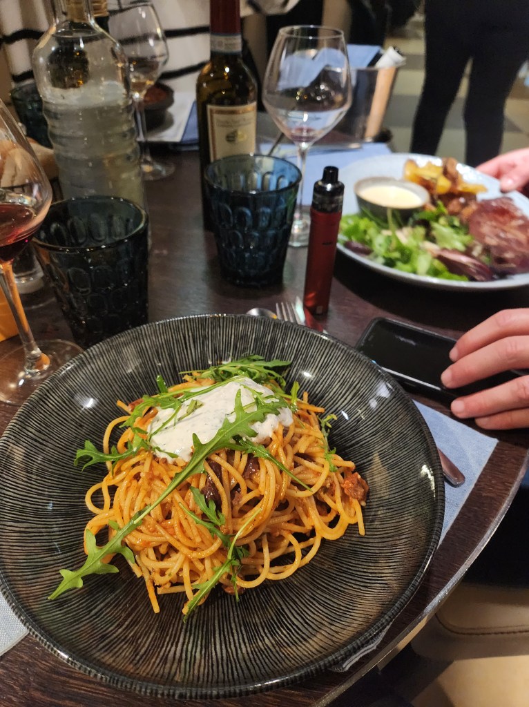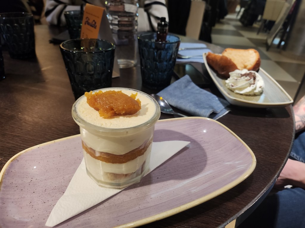 Encore une fois, j’ai adoré l’apéro, le plat de Pâtes Amore (végé), le vin rouge et le superbe dessert : un tiramisu à l’orange. Par contre, le baba au rhum de Jonathan était peut être un peu trop alcoolisé.