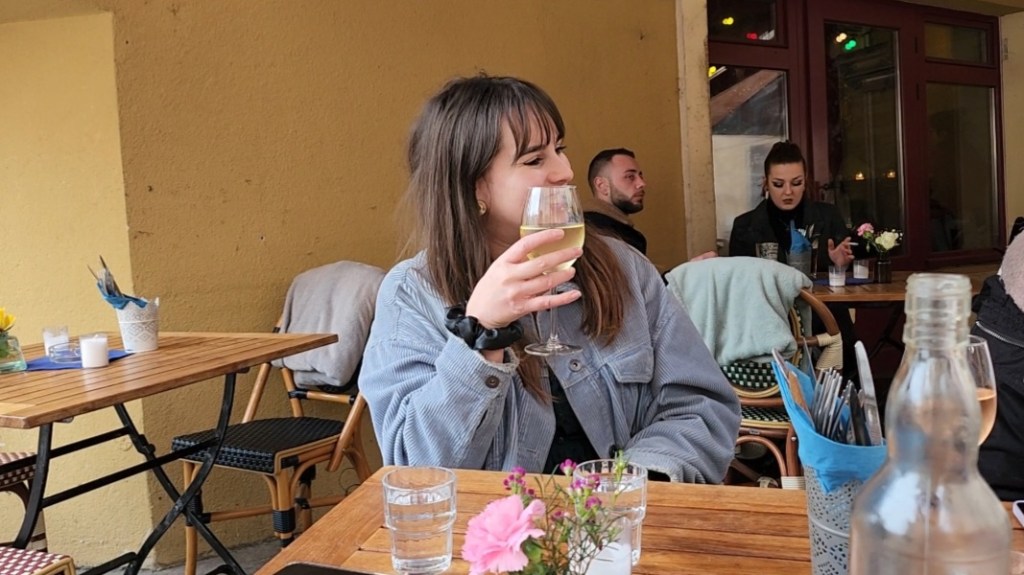 La salade veggie était délicieuse : une mozzarella panné, du pesto, des tomates, de l’avcat.. Le tout accompagné d’un verre de Sauvignon.