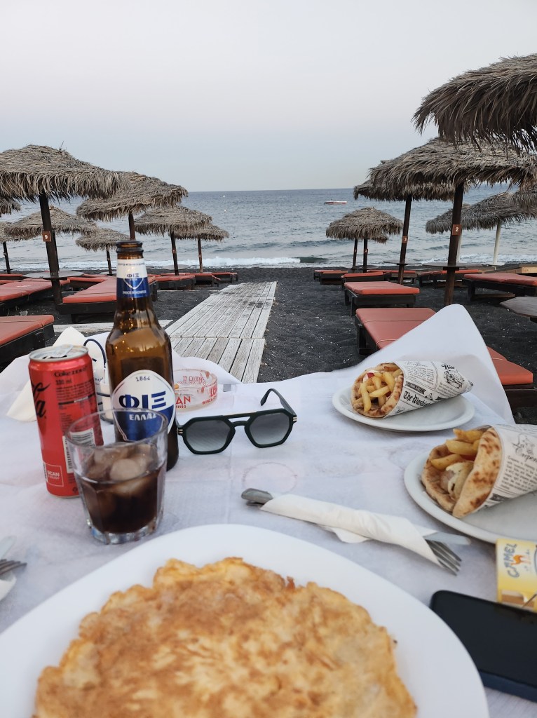 Le premier soir, après notre arrivés vers 18h, nous sommes allés manger à Perissa, à côté de notre logement. Jonathan avait pris des Gyros et moi, une omelette. Autant le cadre était splendide, autant la nourriture pas incroyable.