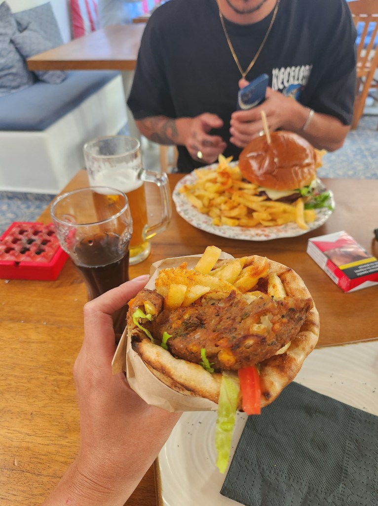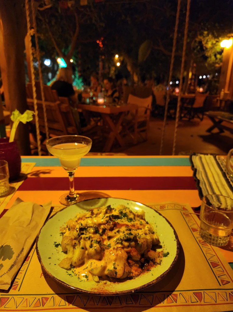 Tranquilo, un restaurant végétalien en bord de plage à Périssa. Une superbe adresse ! Un cadre vraiment joli et une belle ambiance, des cocktails délicieux et des plats végés et ne plus savoir quoi choisir ! J’ai pris une assiette avec des pommes de terre et du cheddar végé et Jonathan une salade césar. lui qui n’est pas végétarien a adoré aussi.
