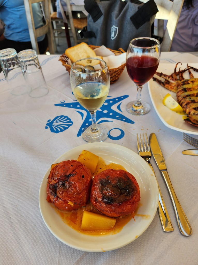 Nous avons déjeuner sur le port au restaurant du Captain John, conseillé par notre guide (qui, d’ailleurs, parlais au moins 4 langues : grecque, anglais, français et italien !). Ce restaurant était vraiment bon : j’avais des tomates farcis au riz et des pommes de terre délicieuses. Par contre, le vin et le pain n’étaient pas supers (je dis ça en bonne française, évidemment).
