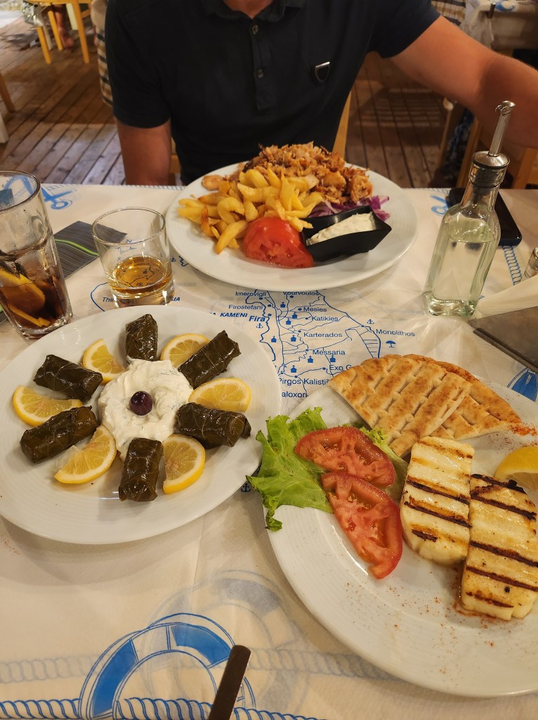 Toujours à Perissa, notre dernier restaurant du voyage était l’Acropolis. Pour finir en beauté, nous avons pris ce que nous avons préféré de tout le séjour en Grèce : des gyros ! Lui, assiette de gyros au poulet et moi, assiette végétarienne (avec du fromage halloumi). en plus, une assiette de riz vinaigré aux feuilles de vignes (original, mais vraiment pas mauvais).