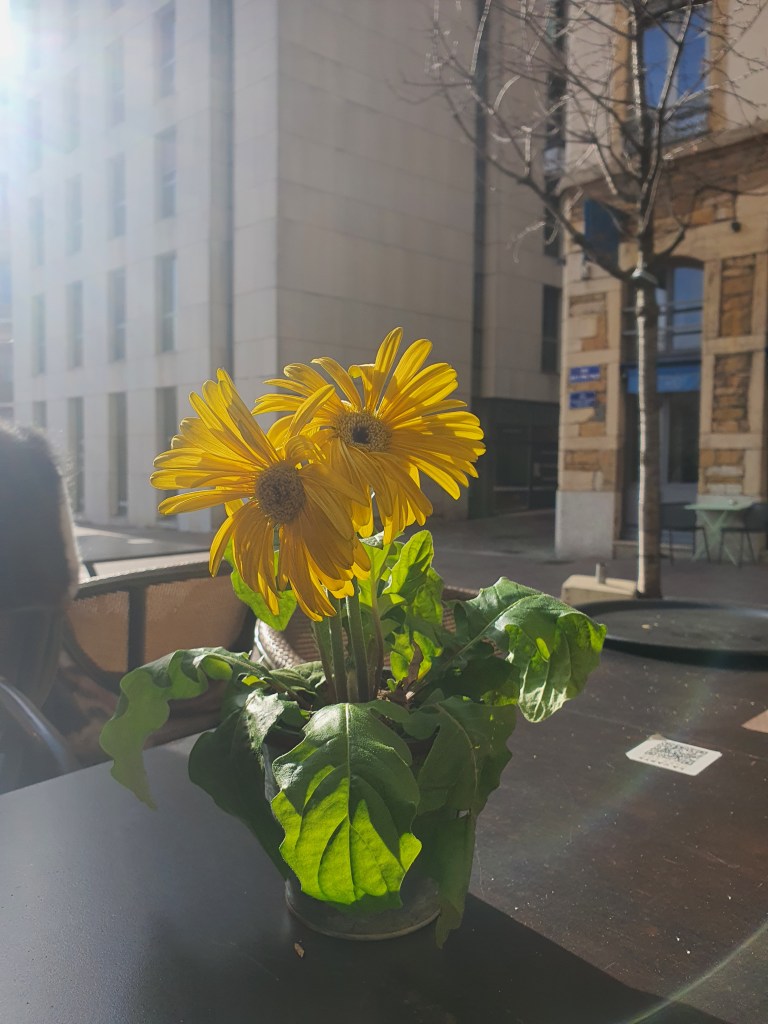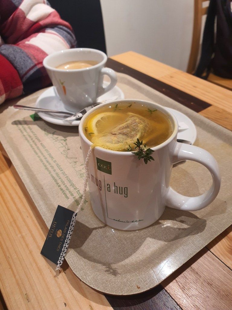 Ensuite, on a cherché un café pour se poser, boire un peu et réfléchir à la suite de l’itinéraire Street Food ! On s’est arrêté dans un café Exki à Lyon République.
