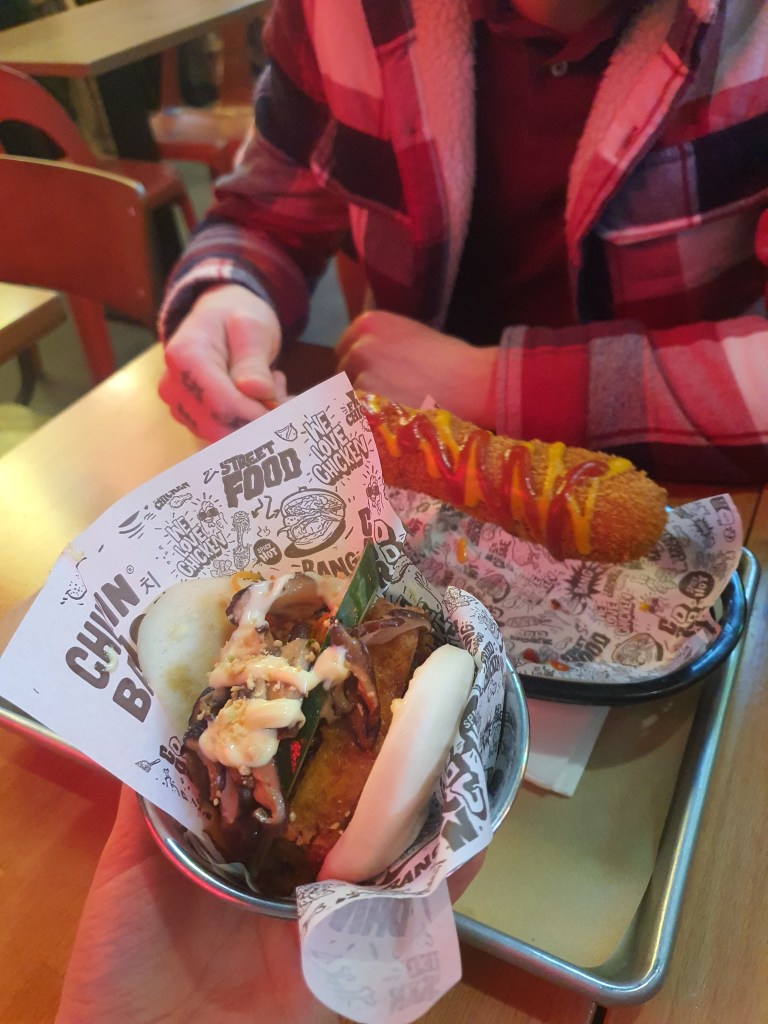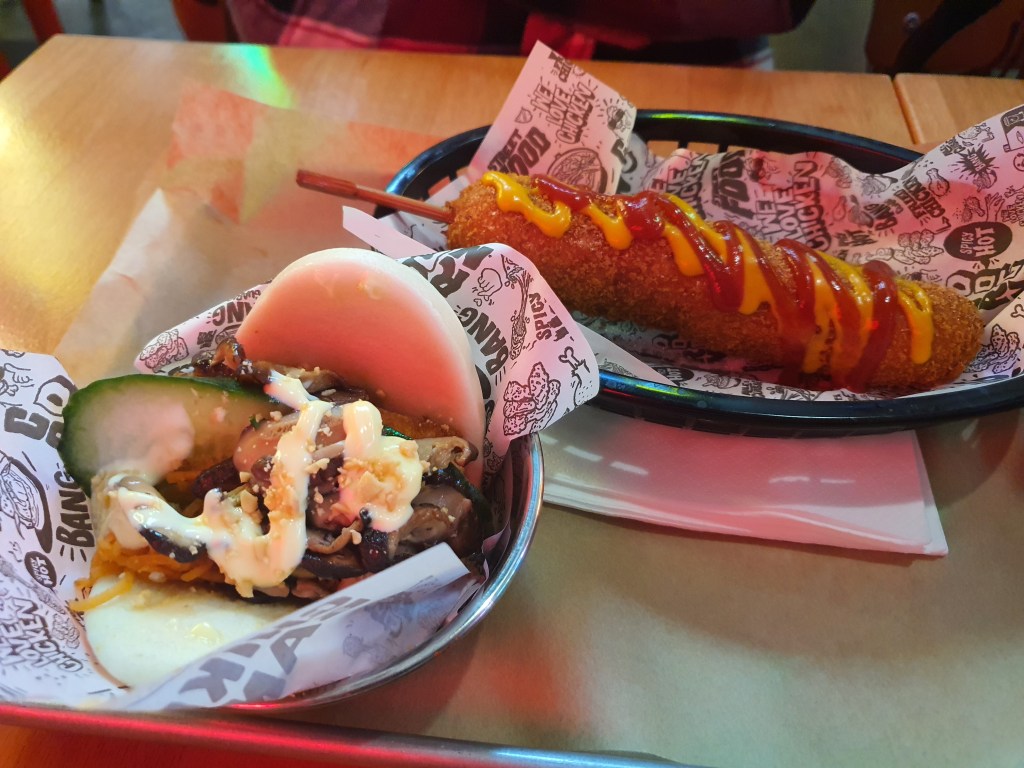 Il a choisi l’emblématique Corn Dog et une bière, et moi j’ai choisi un Guabao végétarien qui était très très bon.