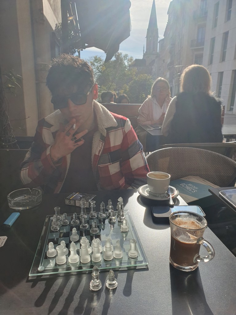 On a sorti notre nouveau jeu d’échecs et on a fait quelques parties sur la terrasse, sous le doux soleil de février.